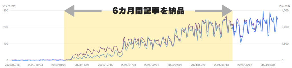 - 6カ月間記事の納品を行い、アクセスは全体的な増加傾向です。